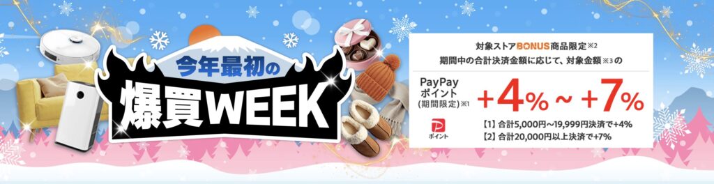 「5のつく日キャンペーン」は、毎月「5日 / 15日 / 25日」に開催される定番キャンペーンです指定の支払い方法でお買い物をすると、購入対象金額の+4%相当のPayPayポイント(期間限定)が付与されます。