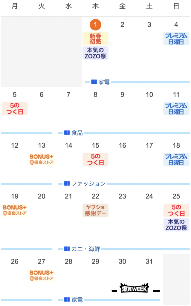 | 25 日 | 5のつく日 PayPayカードなら5のつく日+1% 掲載ストア限定クーポン 本気のZOZO祭 | +4% +1% 5%OFFクーポン +10% |
