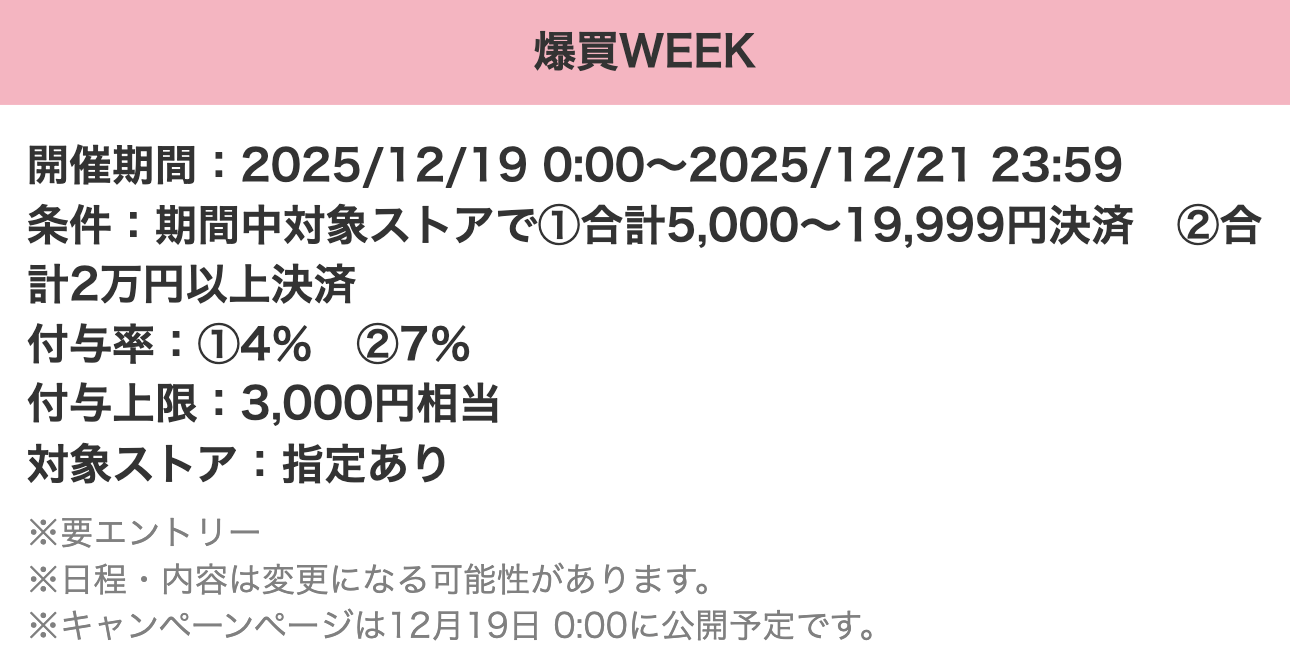 | 19 | 爆買WEEK ボーナスストアPlusでさらに+2% | +4or7% +2% |